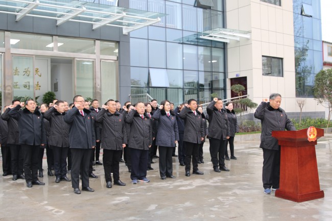 上午9时,乔迁仪式正式开始,全体参会干警在城郊法庭庭长曹正伟的带领下进行宪法宣誓,大家紧握右拳,面对国旗,作出人民法官的庄严承诺。