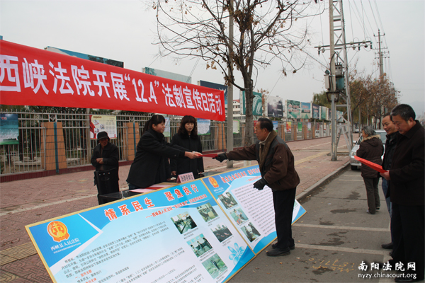 12月4日是全国法制宣传日,河南省西峡县人民法院组织干警走上街头大张旗鼓进行法制宣传,法院结合十八大精神,采取悬挂标语、发放普法宣传单、制作宣传版面、法律咨询等形式宣传宪法和法律,解答群众的法律疑问,受到社会各界的好评,达到了普法宣传的最佳效果。