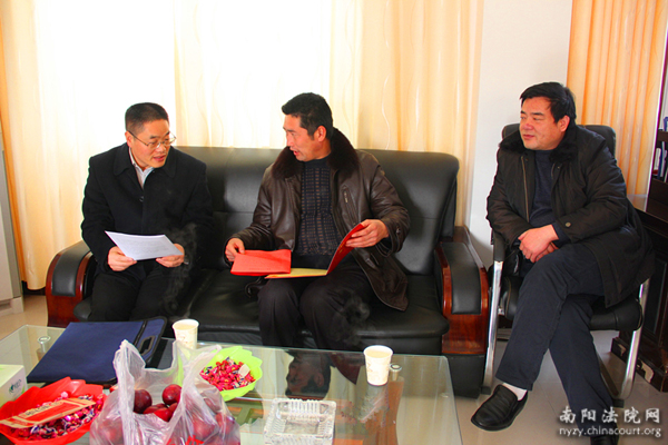 1月10日,河南省高院民三庭副庭长宋旺兴在南阳中院民二庭庭长王立谦和西峡法院院长宋长青的陪同下,带着省高院院长张立勇亲笔签名的贺信和西峡法院致省人大代表的感谢信,上门走访了西峡县省人大代表朱书成和马景龙,向他们汇报了2008年以来全省法院的主要工作情况,并认真征求他们对各级法院工作的意见及建议。