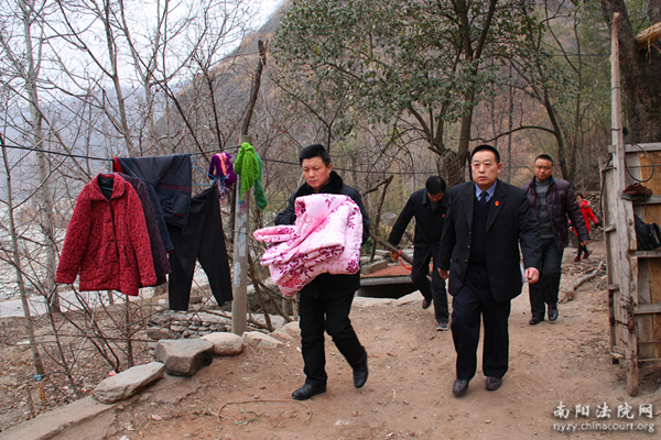 1月30日,河南省西峡县人民法院副院长权波带领驻村干警王丰敏、行政庭庭长张璐等一行到桑坪镇黄沙村扶贫帮扶点走访慰问山区贫困老人和老党员,给这些贫困的群众、党员送去了1000斤面粉、20条棉被和现金等物。副院长权波和驻村干警一起冒着严寒雾霾驰车100多里来到万沟口组、黄沙街组,先后走进70多岁高龄的老党员吴朝正及常年有病家境极度贫困的年逾八旬的汪春华夫妻家中,送去全院干警的一片爱心和温暖。同时还召开专门的村“两委”班子会,征求意见建议,了解群众所想所思所盼,充分体现民情民意,发动全院干警积极为贫困山区更多群众捐资捐物,让困难群众安全过冬幸福过年。